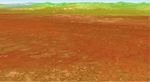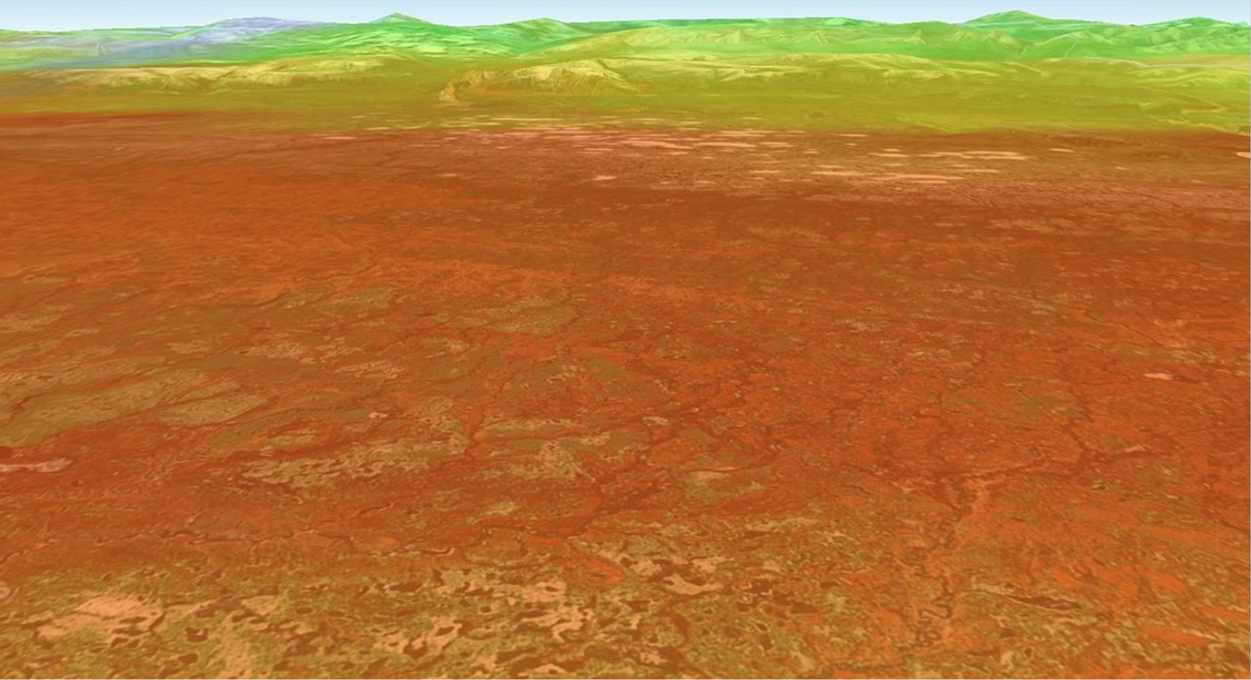 Bromine explosion on March 13, 2008 across the western Northwest Territories in Canada looking toward the Mackenzie Mountains at the horizon, which prevented the bromine from crossing over into Alaska. The bromine explosion is depicted in the foreground by the red-orange areas, while the green shades at high altitudes on the mountains represent areas where there was no increase in bromine.
