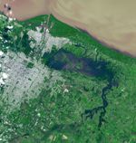 The Advanced Spaceborne Thermal Emission and Reflection Radiometer (ASTER) instrument on NASA's Terra spacecraft captured this view of severe flooding in La Plata, Argentina, on April 4, 2013. Torrential rains and record flash flooding has killed more than 50 and left thousands homeless, according to news reports. La Plata is located 20 miles (50 kilometers) from Buenos Aires. In the image, flooded areas east and west of the city appear in dark blue. A heavy sediment load gives the Rio Plata its yellow-brown color. The image covers an area of 15.8 by 16.7 miles (25.5 by 27 kilometers) and is located at 34.8 degrees south latitude, 58 degrees west longitude.