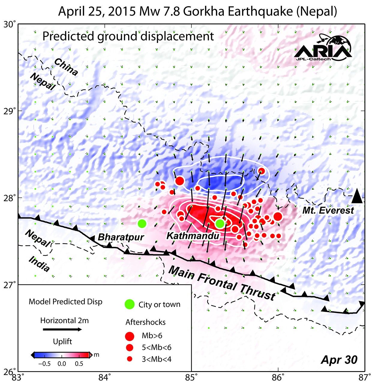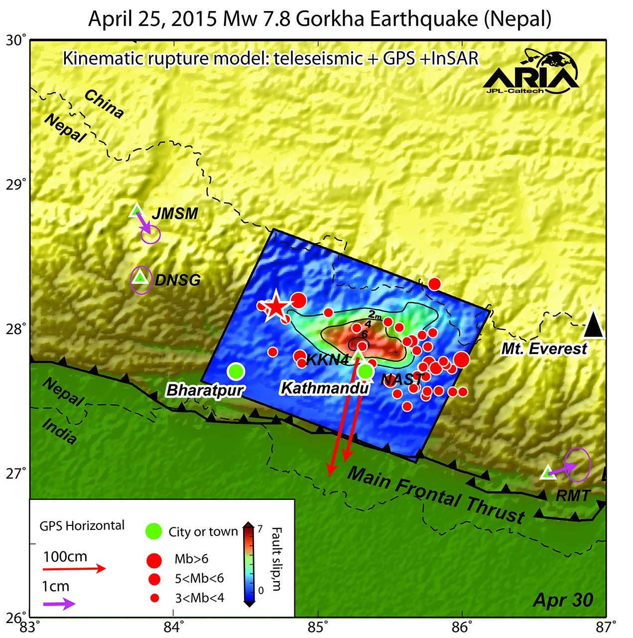 Using a combination of GPS-measured ground motion data, satellite radar data, and seismic observations from instruments distributed around the world, scientists have constructed preliminary estimates of how much the fault responsible for the April 25, 2015, magnitude 7.8 Gorkha earthquake in Nepal moved below Earth's surface (Figure 1). This information is useful for understanding not only what happened in the earthquake but also the potential for future events. It can also be used to infer a map of how Earth's surface moved due to the earthquake over a broader region (Figure 2).