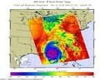 The large purple area indicates very cold clouds carried high into the atmosphere by deep thunderstorms. These storm clouds are associated with heavy rainfall. The warmer eye of the hurricane, located at the center of the cold clouds, is shown in green. The red areas are mostly cloud-free areas, with the clear air caused by air motion outward from the cold clouds near the storm center then downward in the surrounding areas.