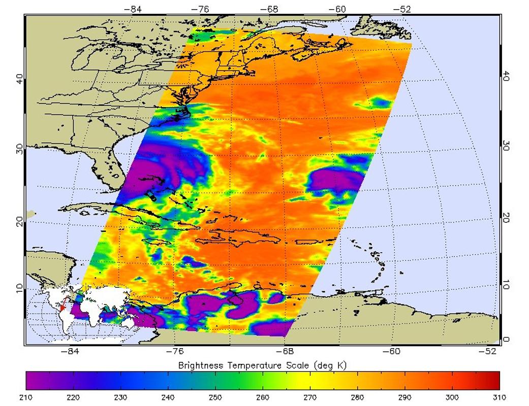 At 11:29 p.m. PDT on Oct. 6 (2:29 a.m. EDT on Oct. 7), NASA's Atmospheric Infrared Sounder (AIRS) instrument on NASA's Aqua satellite produced this false-color infrared image of Matthew as the storm moved up Florida's central coast. The image shows the temperature of Matthew's cloud tops or the surface of Earth in cloud-free regions, with the most intense thunderstorms shown in purples and blues.