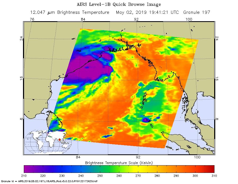 This image shows Tropical Cyclone Fani just off the east coast of India in the Bay of Bengal. NASA's Atmospheric Infrared Sounder (AIRS) collected the image at about 1 p.m. PDT (4 p.m. EDT) today, May 2. At the time, the cyclone's wind speeds were equivalent to a Category 4 hurricane, with maximum sustained winds of 155 mph (249 kph) and gusts of up to 190 mph (306 kph), according to the Joint Typhoon Warning Center. The cyclone is expected to make landfall on Friday, May 3.