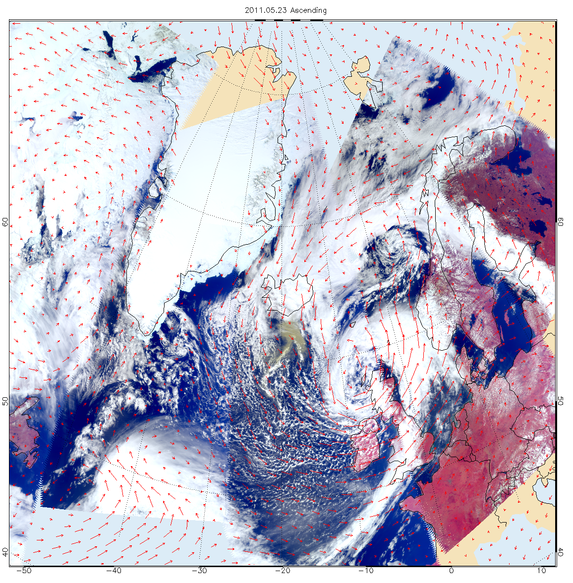The second image, acquired May 23, 2011, combines a high-resolution false-color image from the AIRS instruments' visible sensor with GEOS-5 winds at 850 millibars. Unlike the sulfur dioxide plume in the upper troposphere, heavier ash particles are seen to be transported by lower-troposphere winds southward from Iceland.