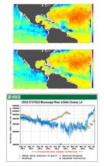Tropical Storm Lee made landfall over New Orleans on Sept. 2-3, 2011, with predicted rainfall of 15 to 20 inches (38 to 51 centimeters) over southern Louisiana. This coincided with a surge in discharge from the Mississippi River around that time (bottom chart). NASA's Aquarius instrument on the Aquarius/SAC-D spacecraft detected a corresponding low-salinty feature, as seen in the Aquarius weekly composite image (Aug 28 -- Sept 3) in the top diagram (the low-salinity feature is the blue color region between the Mississippi River delta and the Florida panhandle). This preliminary finding is likely the result of both the increased river discharge and heavy rainfall from the storm directly on the sea surface. The low-salinity feature is gone by late October, as seen in the middle image. Further analyses will be done to verify this finding.