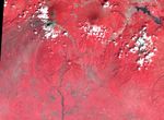 NASA's ASTER (Advanced Spaceborne Thermal Emission and Reflection Radiometer)captured these images of Guatemala's Fuego volcano on Nov. 24, following a recent eruption. The main image shows the lava flows on the flanks of Fuego (upper left corner) in light gray. Vegetation is shown in red, clouds in white, and city and fields in dark gray. A thick ash plume rising from the peak of the volcano and more diffuse ash clouds over the southern part of the scene are also visible.
