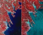 This before-and-after image pair reveals changes to the landscape that are likely due to the effects of the tsunami. The new image is on the left. The image on the right was acquired in August 2008. Areas covered by vegetation are shown in red, while cities and unvegetated areas are shown in shades of blue-gray.