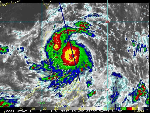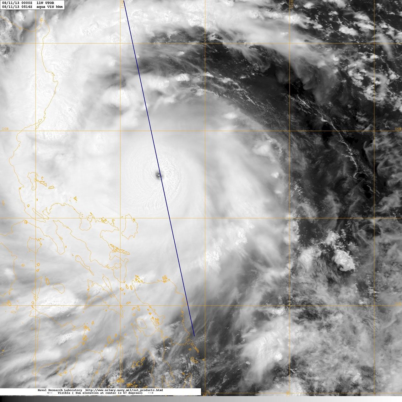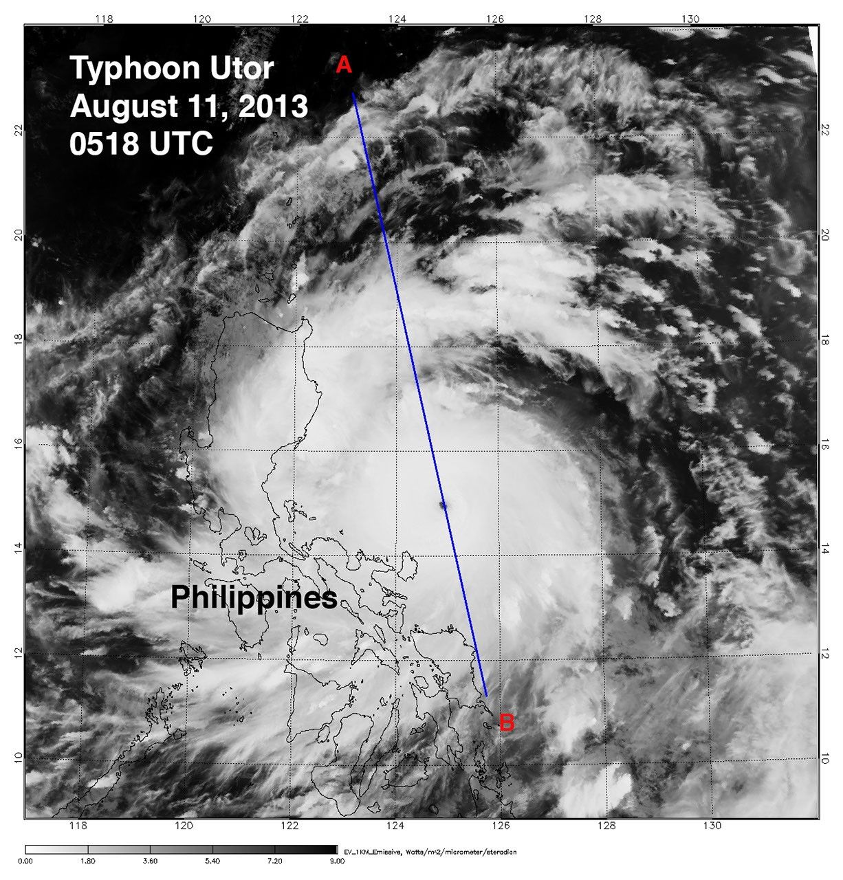 NASA's CloudSat satellite flew over Typhoon Utor in the West Pacific on Aug. 11, 2013 at 0518 UTC, passing within about 6.2 miles (10 kilometers) from the center of the storm, and revealing the structure of the storm's eye and eyewall. At the time, the storm contained estimated maximum strength winds of 132 miles per hour (115 knots) and had a minimum pressure of 937 millibars. Utor's strength was equivalent to a Category 4 strength hurricane.