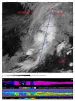 The top image, from NASA's Moderate Resolution Imaging Spectroradiometer instrument on NASA's Aqua spacecraft, reveals the bright white cloud tops from the cluster of thunderstorms. The blue vertical line across the image represents the path of CloudSat at the time the MODIS image was acquired. CloudSat cut through a large thunderstorm cell in the northern section of the country.