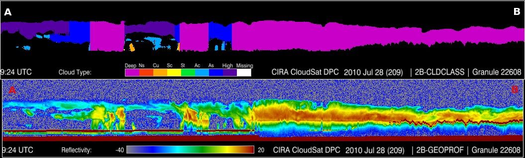 As seen in the top half of the bottom image, CloudSat classified the majority of the clouds present at the time as deep convective (cumulonimbus) clouds, which are typical of thunderstorms. The bottom half of the lower image shows the 3-D vertical structure of the storm along the satellite's flight path, revealing its heavy precipitation. As CloudSat's Cloud Profiling Radar passed over the area of heaviest precipitation, its signal thinned significantly. By the middle of the image, the ground echo (horizontal red line), which represents the topography of the area, completely disappears. The thinning of the radar's signal occurs because larger-sized particles and heavy rains decrease radar reflectivity and become indistinguishable to the radar. As the satellite continued traveling north, rainfall rates decreased and the signal increased, allowing the ground echo (topography) to once again become visible, at the far right of the image. CloudSat measured the height of the clouds along the radar's flight path at around 15 kilometers (9.3 miles) in the areas of deepest convection.
