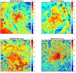 These maps of four European cities show ECOSTRESS surface temperature images acquired in the early mornings of June 27 and 28, 2019, during a heatwave. The images have been sharpened to delineate key features such as airports. Airports and city centers are hotter than surrounding regions because they have more surfaces that retain heat (asphalt, concrete, etc.).