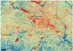 Even early in the day, manmade urban surfaces near city centers and transportation networks – streets, roads, and highways shown in red and orange – are warmer than the outskirts by up to 18 degrees Fahrenheit (10 degrees Celsius). The paved surfaces at Dallas/Fort Worth International Airport, shown in red near the top-center of the image, had the warmest temperatures, exceeding 86 F (30 C).