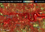 NASA's Ecosystem Spaceborne Thermal Radiometer Experiment on Space Station (ECOSTRESS) instrument recorded this image of ground surface temperatures in London and surrounding areas on July 15, 2022, just before midnight local time. It shows surface temperatures exceeding 68 degrees Fahrenheit (20 degrees Celsius) at 11:57 p.m. British Summer Time.