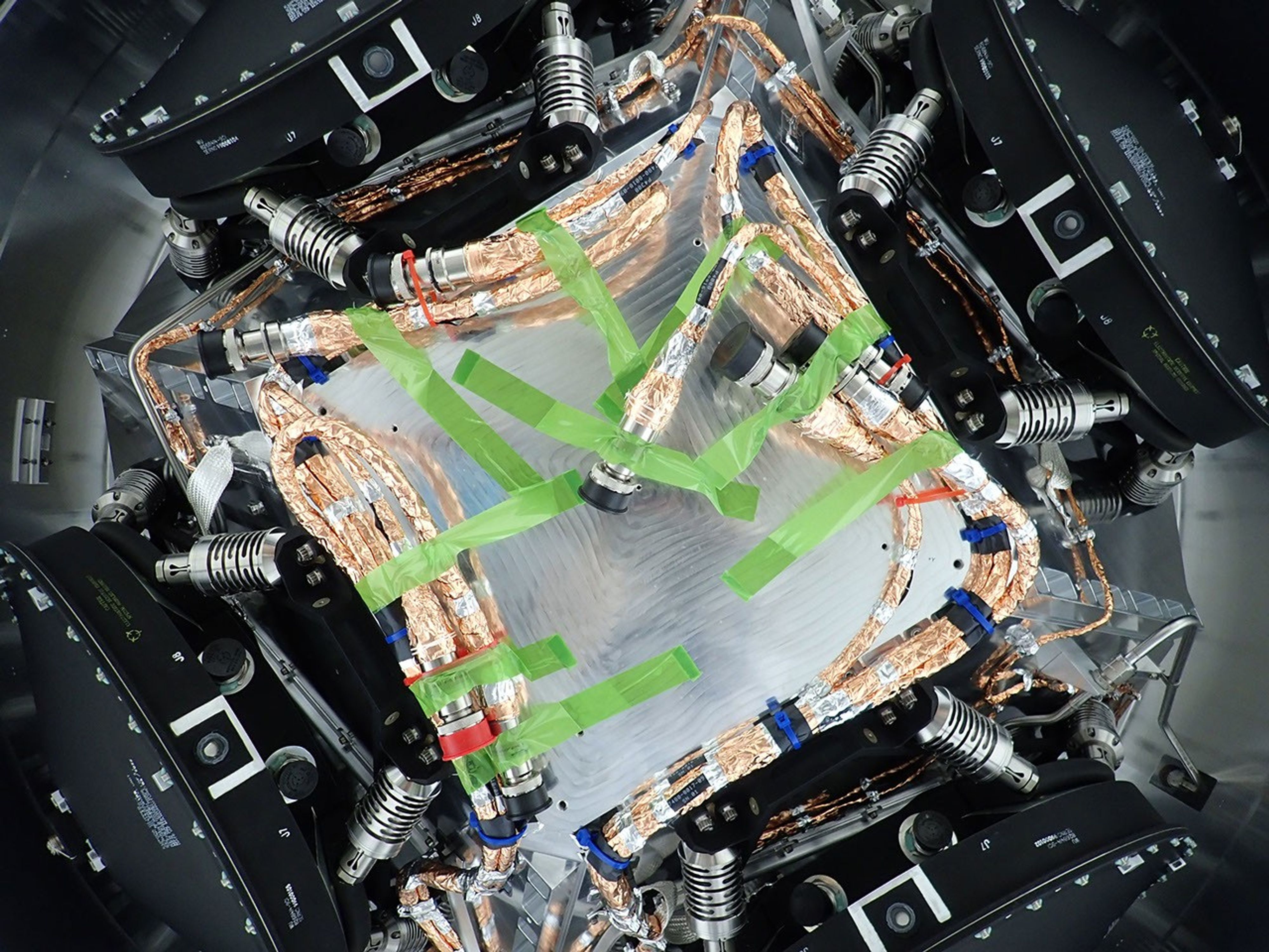 All four of the reaction wheels installed onto NASA's Europa Clipper are visible in this photo, which was shot from underneath the main body of the spacecraft while it is being assembled at the agency's Jet Propulsion Laboratory in Southern California.