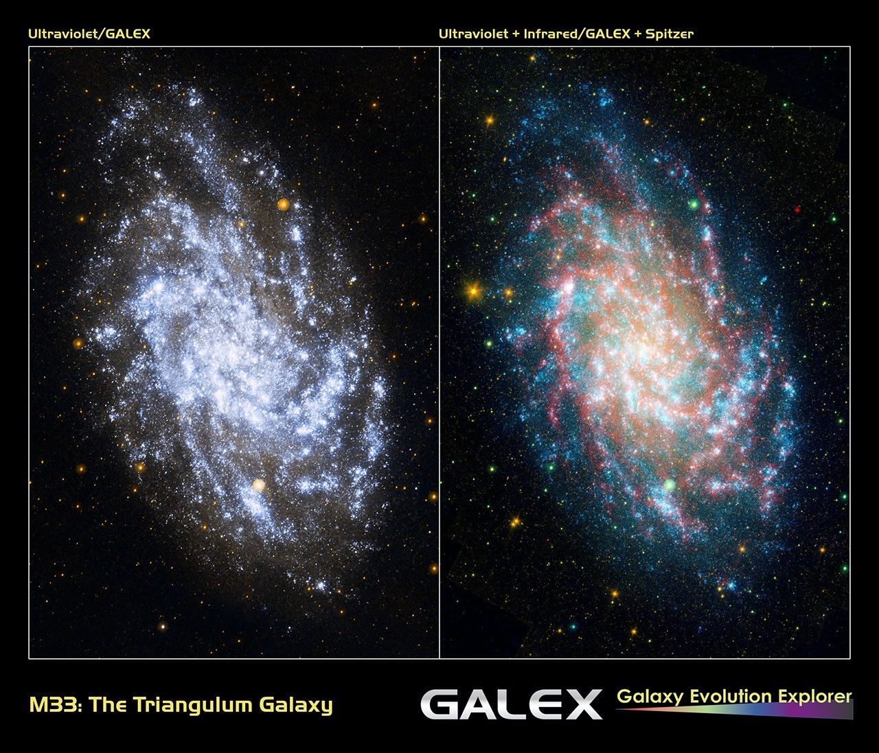 In addition, the ultraviolet image shows the most massive young stars in M33. These stars burn their large supply of hydrogen fuel quickly, burning hot and bright while emitting most of their energy at ultraviolet wavelengths. Compared with low-mass stars like our sun, which live for billions of years, these massive stars never reach old age, having a lifespan as short as a few million years.