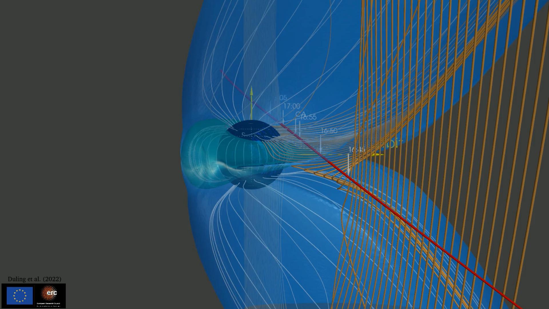 This animation illustrates how the magnetic field surrounding Jupiter's moon Ganymede (represented by the blue lines) interacts with and disrupts the magnetic field surrounding Jupiter (represented by the orange lines).