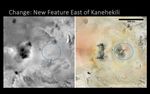 The feature is new since NASA's Galileo captured the area in 1997 (image at left), and consists of two thin, digitate flows, running roughly to the west and southwest from a common point at 17 degrees 2 minutes south latitude and 21 degrees 9 minutes west longitude.