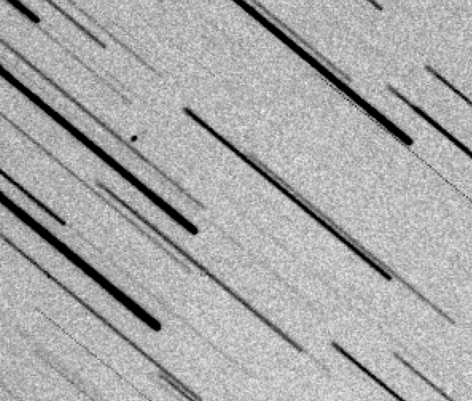 These images were acquired about 39 hours after launch, when the two spacecraft were 145,000 miles (235,000 kilometers) from Earth. Black and white in the images have been inverted so that the brighter the object, the darker it is. To detect the faint reflected light from both spacecraft, they stacked 80 images, each from a 10-second exposure (for a total exposure time of 800 seconds), based on the rate of motion and direction of the spacecraft. This method resulted in stars appearing as long trails and the two spacecraft appearing as dots.