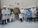 Members of NASA's Lunar Trailblazer team pose with the spacecraft at SpaceX's payload processing facility at NASA's Kennedy Space Center in Florida in early February 2025. The grated radiator of the High-resolution Volatiles and Minerals Moon Mapper (HVM³) instrument is facing the camera. Pictured, from left: Andrew Klesh, Jeff Pyle, Ryan Kressler, Willie Parker, Jon Newman, Alex Sugarman, David Rodriquez, Chris Calamateos-Brown, and David Hobbs.