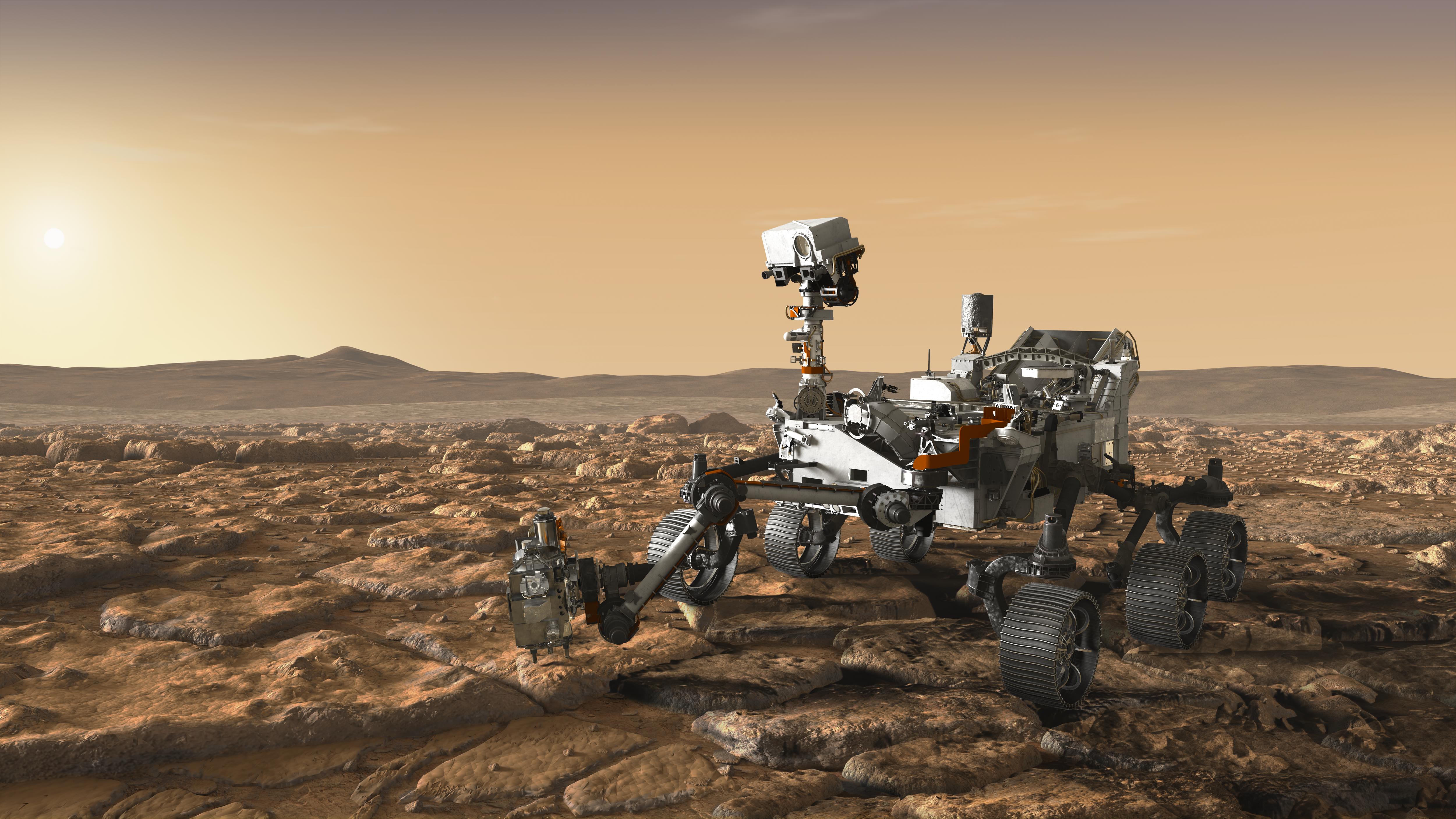 This artist's concept depicts NASA's Mars 2020 rover exploring Mars.