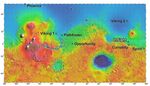 The location of the landing site for InSight is indicated on this near-global topographic map of Mars, which also indicates landing sites of current and past NASA missions to the surface of Mars.