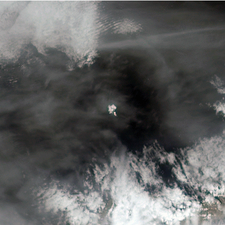 On May 28, 2017, at approximately 2:23 p.m. local time, NASA's Terra satellite passed over Bogoslof, less than 10 minutes after the eruption began. MISR has nine cameras that view Earth at different angles. It takes slightly less than seven minutes for all nine cameras to view the same location on Earth. On the left, an animation made from the images from the nine MISR cameras, captured between 2:19 and 2:26 p.m., demonstrates how the angled views give a glimpse of the underside of the growing plume of volcanic ash, showing the eruption column widening into the cloud at the top.