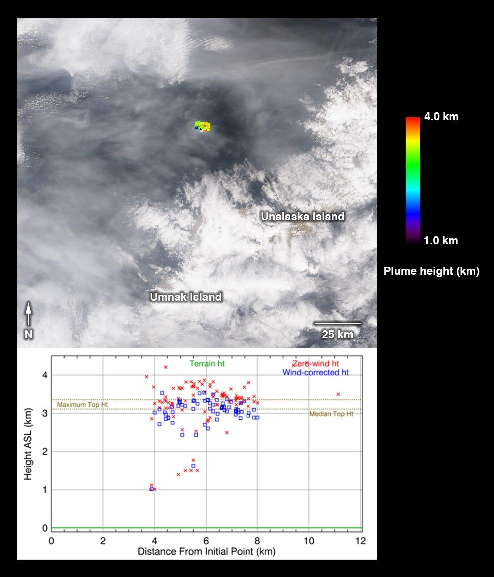 Data from MISR's nine cameras can also be used to calculate the height of the plume, based on the apparent movement of the cloud from one camera to another. In Figure 1, on the right, a map of plume height is plotted over the downward-looking image. The top of the cloud was approximately 10,000 feet (3 kilometers) high at this time. Below the image is a scatterplot of the heights, with blue points representing heights corrected by the northwesterly winds reported by the Alaskan Volcano Observatory during the eruption, and red points representing uncorrected heights. Lower points at either side of the plume represent retrievals of the eruption column.