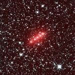 The image spans half of one degree. It shows the comet moving in a mostly west and slightly south direction. (North is 26 degrees to the right of up in the image, and west is 26 degrees downward from directly right.) The red color is caused by the strong signal in the NEOWISE 4.6-micron wavelength detector, owing to a combination of gas and dust in the comet's coma.