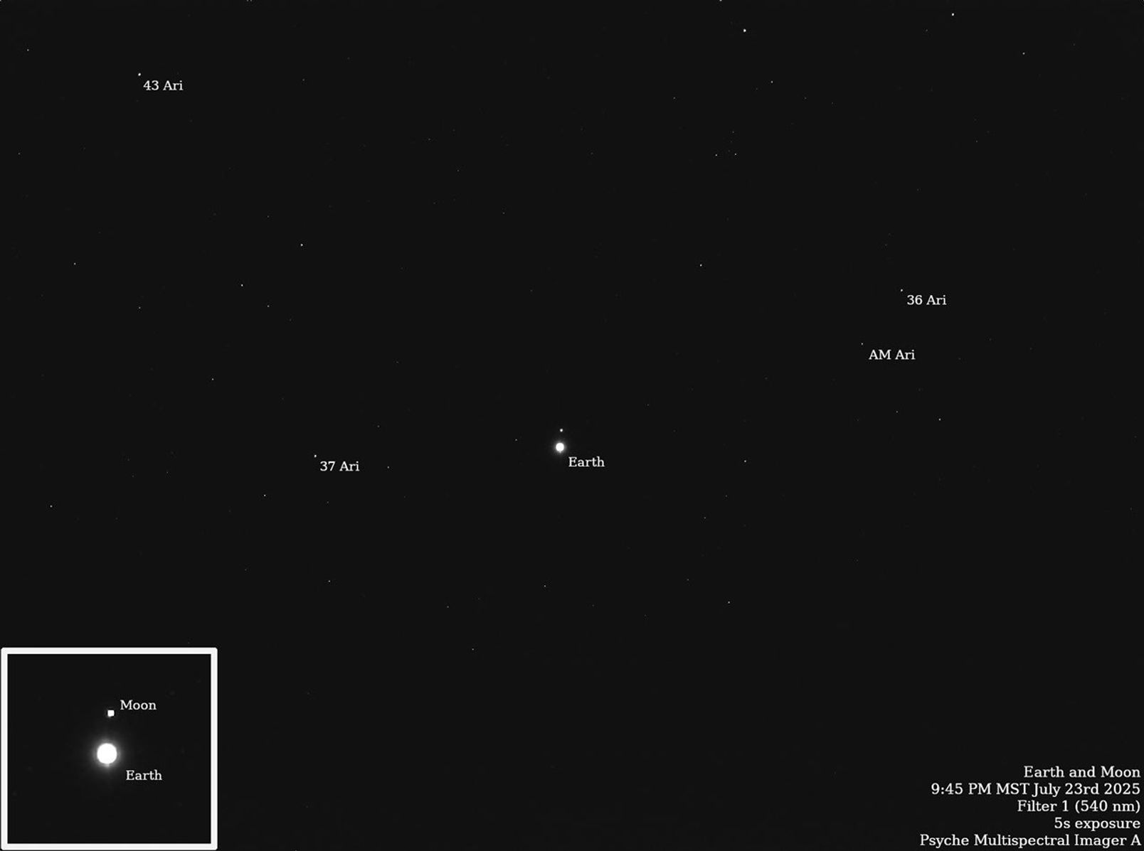 NASA's Psyche spacecraft captured images of Earth and our Moon from about 180 million miles (290 kilometers) away in July 2025. The images were obtained during one of the mission team's periodic maintenance and calibration tests for the twin cameras that make up the imager instrument.