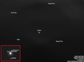 The starfield pictures shown here are long-exposure (five-second) images captured by each camera. By over-exposing Jupiter to bring out some of the background stars in the Taurus constellation, the imagers were able to capture Jupiter's fainter Galilean moons as well.