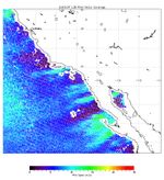 The scope and extent of the strong Santa Ana wind event in Southern California the week of Oct. 21, 2007, is visible in this image from NASA's QuikScat satellite. The image, obtained at about 7 a.m. October 22, depicts the wind speed (colors) and direction (white arrows) of the strong winds blowing offshore from Southern and Baja California. Higher wind speeds are depicted in green.