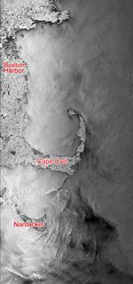 This Seasat synthetic aperture radar image from Aug. 27, 1978, shows the Massachusetts coast from Nantucket Island in the south past Cape Cod and Boston to Cape Ann in the north. The dark patch east and south of Nantucket is caused by the Nantucket Shoals, where a shallow ocean bottom creates surface waves and currents that appear as variations in brightness on the image. More subtle darker and lighter stripes to the east and north of Cape Cod are caused by internal waves, which are formed within the ocean by tides, rather than on the ocean surface by winds.