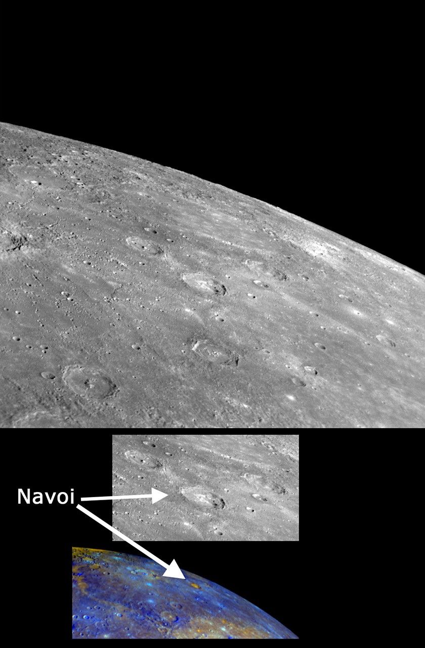 At the center of this NAC image is the crater Navoi, named in November 2008 for the Uzbek poet Alisher Navoi (1441-1501) (see PIA11762). Located in the far north of Mercury’s northern hemisphere, Navoi can be seen clearly as a bright orange feature near the top of a previously released enhanced-color Wide Angle Camera (WAC) image of the Caloris basin (part of which is shown in this release) (see PIA10359). As seen in that color WAC image, Navoi contains uncommon reddish material that indicates a different rock composition from its surroundings. In the high-resolution NAC image shown here, Navoi also appears to have an irregularly shaped depression in its center. Such depressions have been seen elsewhere on Mercury, including within Praxiteles crater (PIA12040), and may indicate past volcanic activity.