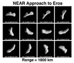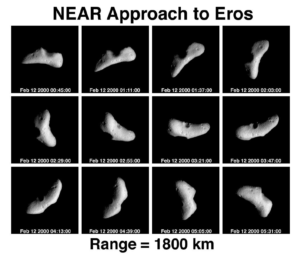On February 12, two days before NEAR's insertion into orbit around Eros, during a five-hour time span the spacecraft's Multispectral Imager recorded these pictures of the asteroid spinning on its axis. This view, looking down toward the rocky body's north pole, is generally similar to sequences taken on February 6, 10, and 11. But the spacecraft was much closer to Eros (about 1,800 kilometers or a little over 1,100 miles), so the pictures are much sharper.