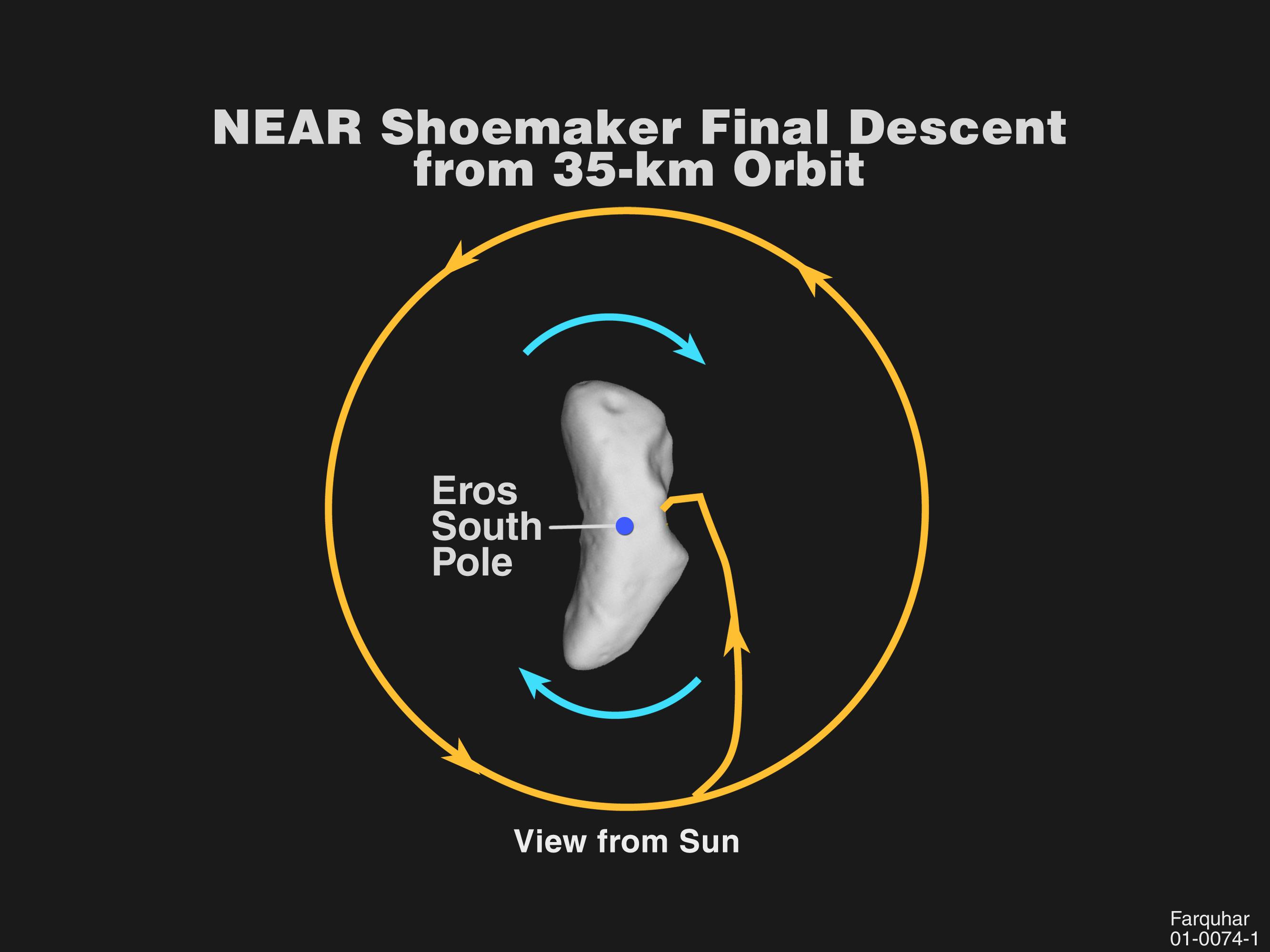 NEAR Shoemaker will de-orbit with a short engine burn at 10:31 a.m. EST, about 4 ½ hours before it's scheduled to reach the surface. The final leg of the controlled descent begins with the spacecraft about 5 kilometers (3 miles) above Eros; it will then execute an unprecedented series of four engine burns designed to slow its descent from about 20 mph to about 5 mph. NEAR Shoemaker is expected to touch down in an area bordering Himeros, the asteroid's distinctive saddle-shaped depression, after providing the highest-resolution images ever taken of Eros' boulder-strewn, cratered terrain.