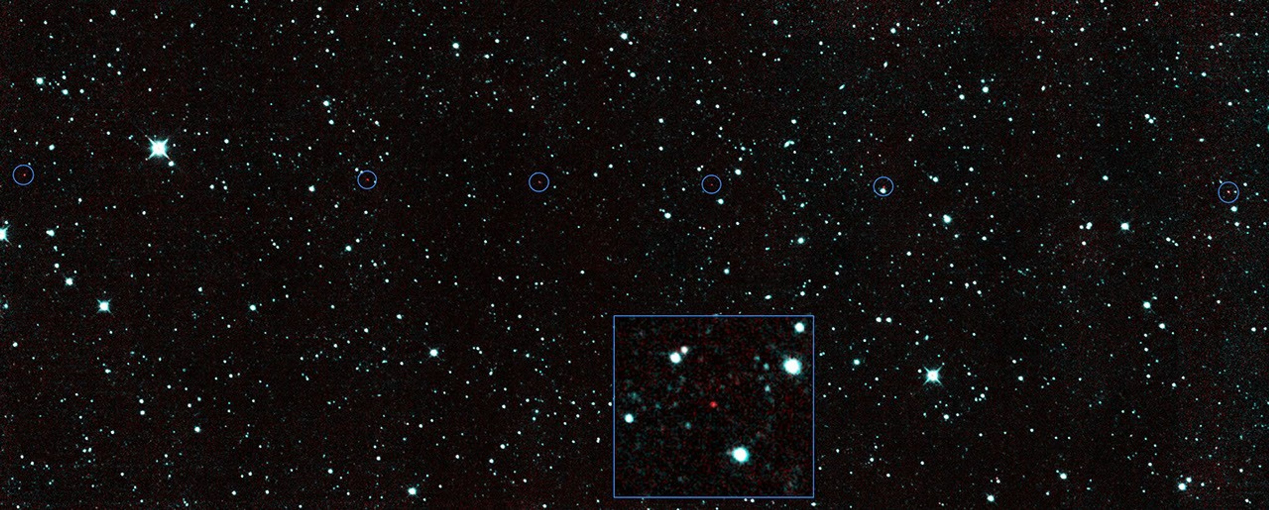 The six red dots in this composite picture indicate the location of the first new near-Earth asteroid seen by NASA's Near-Earth Object Wide-field Infrared Survey Explorer (NEOWISE) since the spacecraft came out of hibernation in December 2013. The asteroid, called 2013 YP139, is the first of hundreds of space-rock discoveries expected during its renewed mission. The inset shows a zoomed-in view of one of the detections of 2013 YP139.