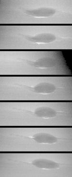 These images show changes in the clouds around Neptune's Great Dark Spot (GDS) over a four and one-half-day period. From top to bottom the images show successive rotations of the planet an interval of about 18 hours. The GDS is at a mean latitude of 20 degrees south, and covers about 30 degrees of longitude. The violet filter of the Voyager narrow angle camera was used to produce these images at distances ranging from 17 million kilometers (10.5 million miles) at the top, to 10 million kilometers (6.2 million miles) at bottom. The images have been mapped on to a rectangular latitude longitude grid to remove the effects of changing viewing geometry and the changing distance to Neptune. The sequence shows a large change in the western end (left side) of the GDS, where a dark extension apparent in the earlier images converges into an extended string of small dark spots over the next five rotations. This 'string of beads' extends from the GDS at a surprisingly large angle relative to horizontal lines of constant latitude. The large bright cloud at the southern (bottom) border of the GDS is a more or less permanent companion of the GDS. The apparent motion of smaller clouds at the periphery of the GDS suggests a counterclockwise rotation of the GDS reminiscent of flow around the Great Red Spot in Jupiter's atmosphere. This activity of the GDS is surprising because the total energy flux from the sun and from Neptune's interior is only 5 percent as large as the total energy flux on Jupiter.