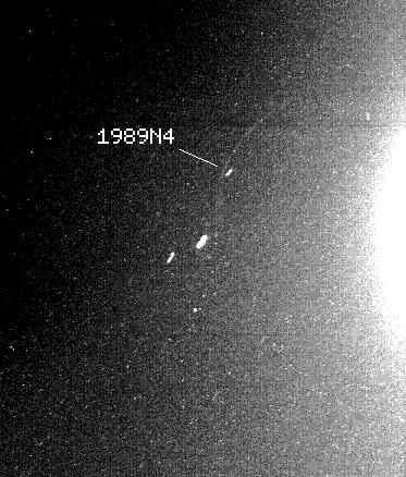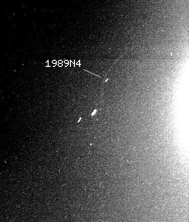One of two new ring arcs, or partial rings, discovered today by NASA's Voyager 2 spacecraft, is faintly visible here just outside the orbit of the Neptunian moon 1989N4, also discovered by Voyager 2 earlier this month. The 155 second exposure taken by Voyager's narrow-angle camera shows the glare of an overexposed Neptune to the right of the moon and ring arc. The two bright streaks below the moon and ring arc are stars. The ring arc is approximately 50,000 kilometers (or 30,000 miles) long. (The second ring arc, not apparent here, is approximately 10,000 kilometers (6,000 miles) long and is associated with the moon 1989N3.) The ring arc, along with 1989N4, orbits about 62,000 kilometers (38,000 miles) from the planet's center, or about 37,000 kilometers (23,000 miles) from the planet's cloud tops. Astronomers have long suspected the existence of such an irregular ring system around Neptune. Data from repeated ground based observations hinted at the existence of irregular strands of partial rings orbiting Neptune. Voyager's photographs of the ring arcs are the first photographic evidence that such a ring system exists. Voyager scientists said the ring arcs may be comprised of debris associated with the nearby moons, or may be the remnants of moons that have been torn apart or ground down through collisions. Close-up studies of the ring arcs by Voyager 2 in coming days should help determine their composition. The Voyager mission is conducted by the Jet Propulsion Laboratory for NASA's Office of Space Science and Applications.
