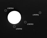 This image captured by the Voyager 2 spacecraft was used to confirm the discovery of three new satellites orbiting Neptune. The 46 second exposure was taken by Voyager 2's narrow angle camera through a clear filter on July 30, 1989, when the spacecraft was about 37.3 million kilometers (23.6 million miles) from Neptune. The large globe of the planet itself is severely overexposed and appears pure white. The image has been computer processed to accentuate the new moons, which otherwise would appear little stronger than background noise. The satellite 1989 N1, at right in this frame, was discovered by Voyager 2 in early July 1989. The new satellites confirmed this week are 1989 N2, 1989 N3 and 1989 N4. Each of the moons appears as a small streak, an effect caused by movement of the spacecraft during the long exposure. The new moons occupy nearly circular and equatorial orbits ranging from about 27,300 to 48,300 kilometers (17,000 to 30,000 miles) from Neptune's cloud tops, and are estimated to range in diameter from about 100 to 200 kilometers (about 60 to 125 miles). The Voyager Mission is conducted by the Jet Propulsion Laboratory for NASA's Office of Space Science and Applications.