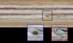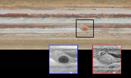 The movement of Jupiter's clouds can be seen by comparing the first map to the second one in this animated pair of images. Zooming in on the Great Red Spot at blue (below, at left) and red (below, at right) wavelengths reveals a unique filamentary feature not previously seen.
