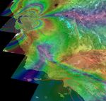 This illustration depicts synthetic aperature radar patterns of seismic deformations associated with a model earthquake on the San Francisco section of the San Andreas Fault (depicted in yellow). Each complete interferometric fringe color cycle corresponds to a displacement of 56 millimeters (2.2 inches).