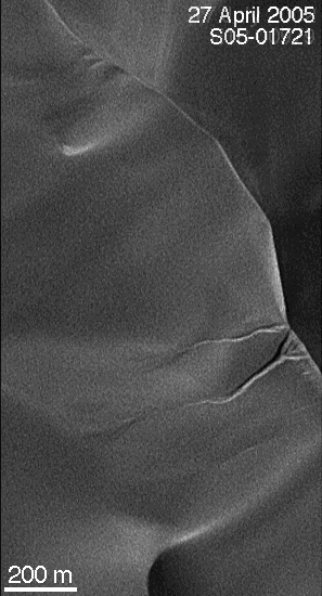 The team has found one location where a new gully formed on a dune in an unnamed crater in the Hellespontus region of Mars, west of the Hellas Basin. This pair of narrow-angle images (figure 1) from the Mars Orbiter Camera shows the dune as it appeared on July 17, 2002, (left) and as it appeared on April 27, 2005, (right). The nearly three Earth years of intervening time amount to about 1.4 Mars years. During this period, a couple of gullies formed on the dune slip face. It is critical to recognize that the 2002 image was obtained at a time of year when the incident sunlight was coming in from a lower angle, relative to the horizon, than in the 2005 image. If the gullies had been present in 2002, their appearance would be sharper and more pronounced than they are in the 2005 image. The gullies simply did not exist on July 17, 2002. The steep walls of the gully alcove and channels suggests that the sand in this dune is somewhat cohesive, an observation common among martian sand dunes seen by the Mars Orbiter Camera over the past eight years.
