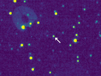 Above, the first two of the 20 observations that New Horizons made of 1994 JR1 in April 2016. The Kuiper Belt object is the bright moving dot indicated by the arrow. The dots that do not move are background stars. The moving features in the top left and far right are internal camera reflections (a kind of selfie) caused by illumination by a very bright star just outside of LORRI's field of view; the one on the left shows the three arms that hold up LORRI's secondary mirror.