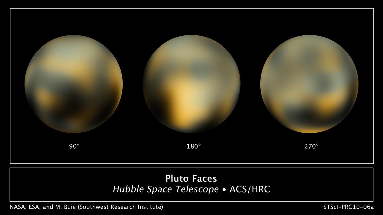 Pluto is so small and distant that the task of resolving the surface is as challenging as trying to see the markings on a soccer ball 40 miles away. The Hubble raw images are a few pixels wide. But through a technique called dithering, multiple, slightly offset pictures can be combined through computer-image processing to synthesize a higher-resolution view than could be seen in a single exposure. This series of pictures took four years and 20 computers operating continuously and simultaneously to accomplish.