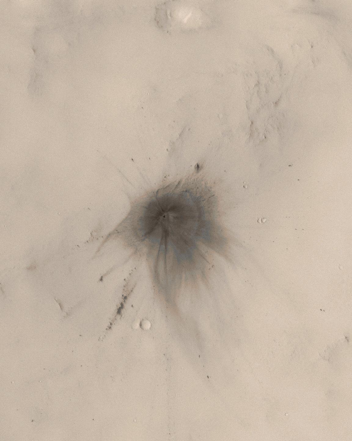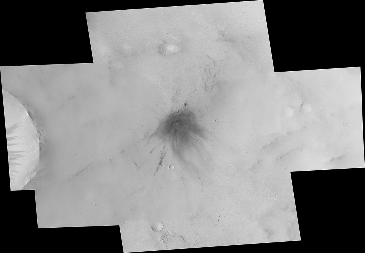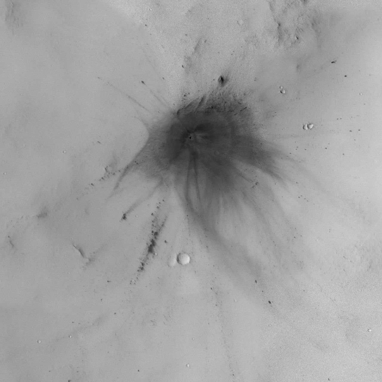 Of the 20 new impact craters found on Mars by the Mars Global Surveyor (MGS) Mars Orbiter Camera (MOC) in 2006, the one shown here is perhaps the prettiest. The darkened "blast zone" around the crater exhibits considerable details about how the energy transferred from the impact to the surrounding atmosphere and dust-mantled surface interacted. Wispy dark rays and dark, annular (nearly-circular) zones surround the crater, while several chains of dark spots formed by secondary impact radiate away for hundreds of meters from the tiny crater.