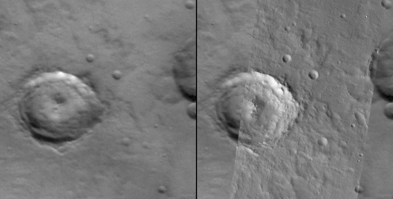 Figure C: This picture shows how the age of the crater was constrained. The first (left) is a portion of MOC red wide angle camera image R12-00786, acquired on 8 December 2003. The white circle indicates the location of the impact site, but the impact had not yet occurred. The second picture (right) shows the same MOC red wide angle image, overlain by a portion of an image from the Mars Odyssey Thermal Emission Imaging System (THEMIS). The THEMIS image is an infrared picture (I17523014, band 9, ~12.6 micrometers) acquired on 26 November 2005. In the infrared image, the impact site shows up as a bright spot because it is warmer than its surroundings during the day. These two pictures, thus, tell us that the impact occurred some time between 8 December 2003 and 26 November 2005.