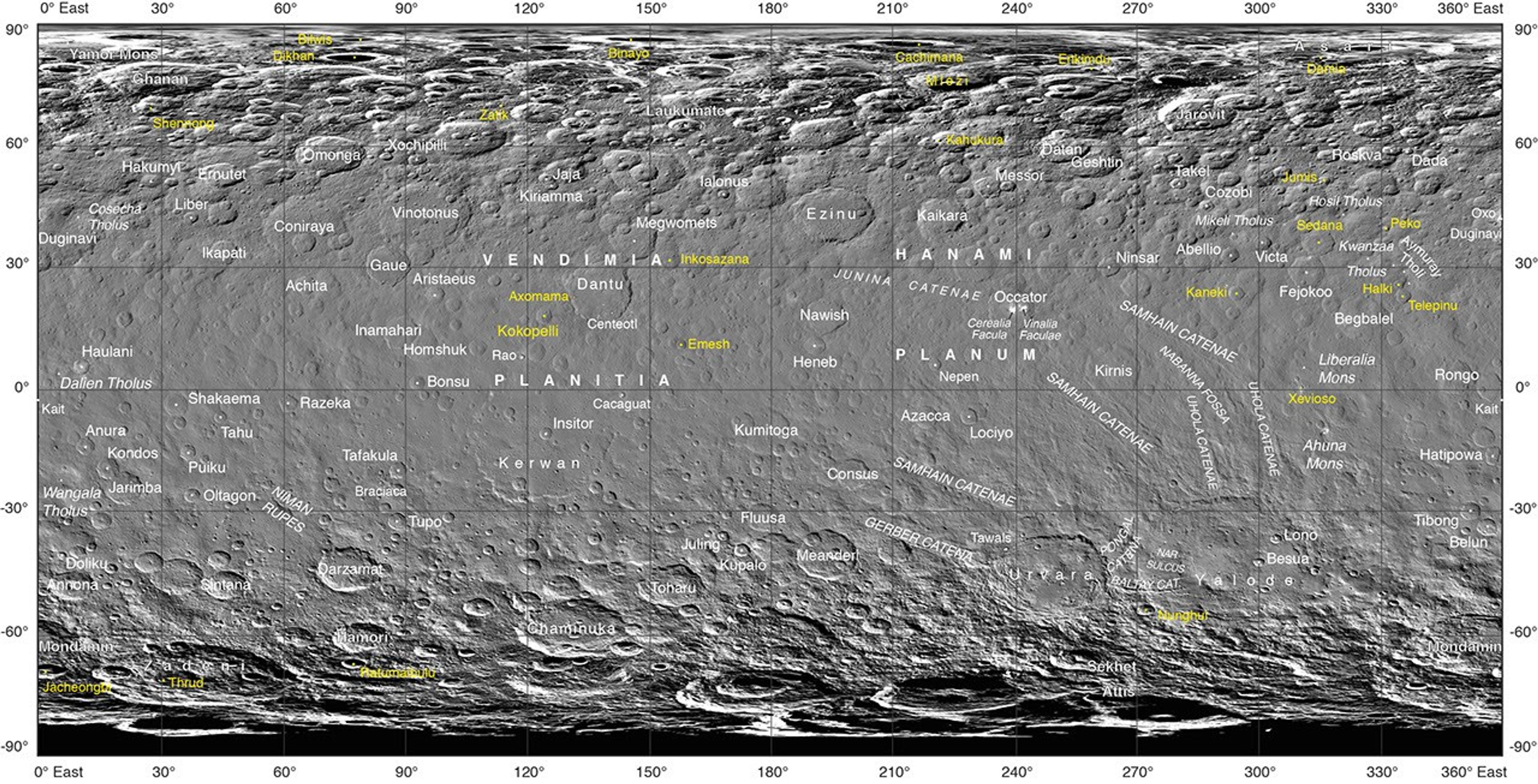Using suggestions from the Dawn team, the IAU recently approved 25 new Ceres feature names tied to theme of agricultural deities, marked in yellow on the map. Emesh Crater, for example, is named for the Sumerian god of vegetation and agriculture. Jumi is the Latvian god of fertility of the field.