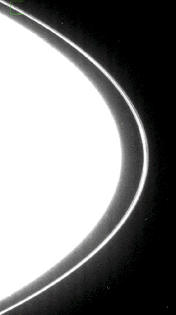 A small new found object, temporarily designated S/2004 S 3, has been seen orbiting Saturn's outer F ring. The tiny object, seen in this movie centered in a green box, orbits the planet at a distance of approximately 141,000 kilometers (86,420 miles) from the center of Saturn. Its nature, moon or clump, is not presently known.