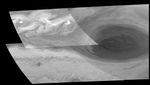 The region west of the Great Red Spot is characterized by large, turbulent structures that rotate clockwise, in the opposite sense of the Great Red Spot. The centers of some of these structures are extremely bright, and may be giant (2000 km) clusters of cumulus clouds. Regions of large-scale turbulence are rare in Jupiter's otherwise very stable and organized atmosphere. North is to the top. Each pixel subtends a square about 29.5 kilometers on a side. The images were obtained on June 26, 1996 by the Solid State Imaging system on board NASA's Galileo spacecraft.