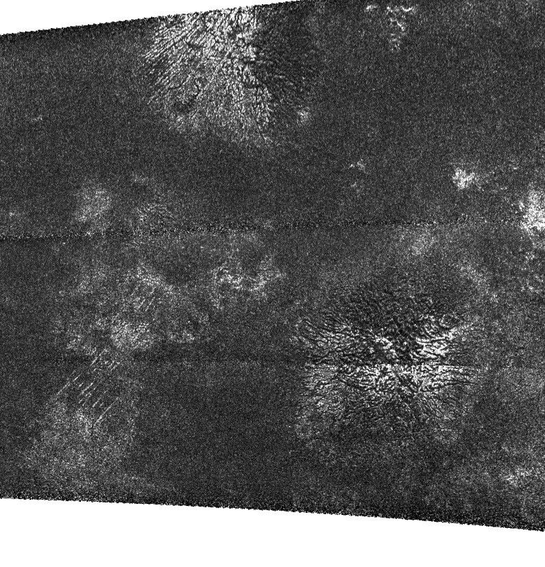Two dark horizontal lines that run across the middle of the image show the joints between individual radar beams and are not features on the Titan surface.