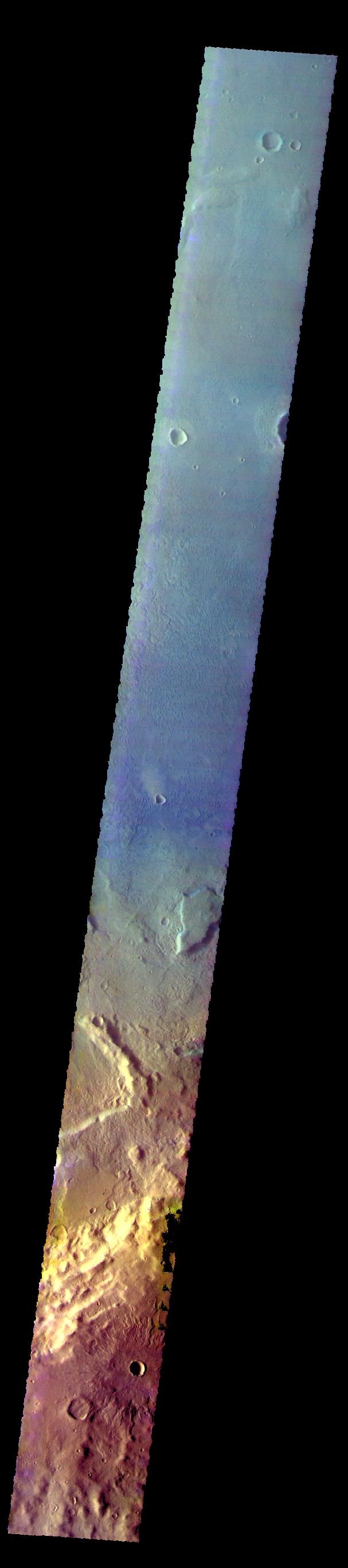The THEMIS VIS camera contains 5 filters. The data from different filters can be combined in multiple way to create a false color image. These false color images may reveal subtle variations of the surface not easily identified in a single band image. Today's false color image shows part of Newton Crater in Terra Siremun.